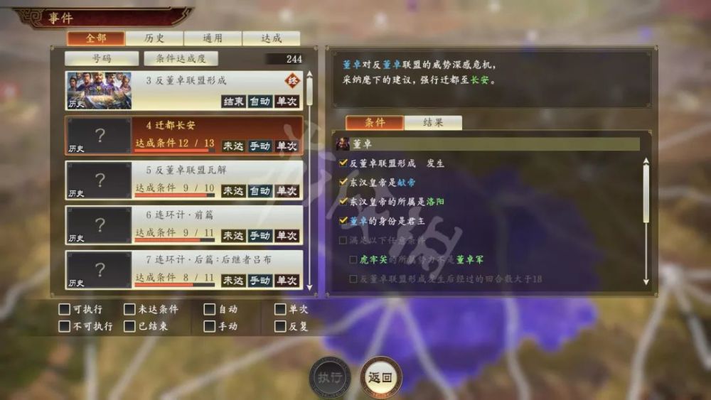 前史事情皆为《三国演义》中的经典剧情桥段。除了桃园结义、反董卓联盟等少量几个是主动触发外,大多需求手动履行。一些事情达到条件后,玩家也可以挑选恰当的发起机遇,为自己获取利益。例如挑选曹操达到董卓“迁都长安”的条件后,玩家也可以提早把部队拉到虎牢关前,再履行“迁都长安”事情,这样洛阳就会变为空城,玩家也可以不费吹灰之力占据。