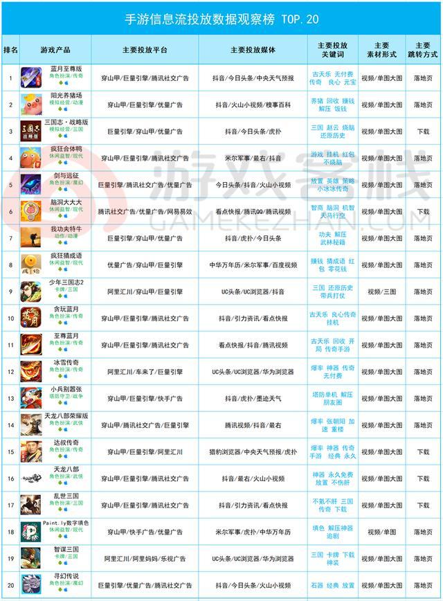 一起,前20款游戏产品大都投进的资料类型为视频和单图大图,而在2月新年期间,许多游戏的投进资料类型仅为视频内容。而且挑选不运用落地页跳转的游戏产品在添加,比方《三国志·战略版》、《达叔传奇》、《天龙八部》、《浊世三国》等。特别是《三国志·战略版》,该手游2月新年期间还运用的是落地页跳转下载使用APP,到现在现已改为直接跳转下载使用APP的方法。