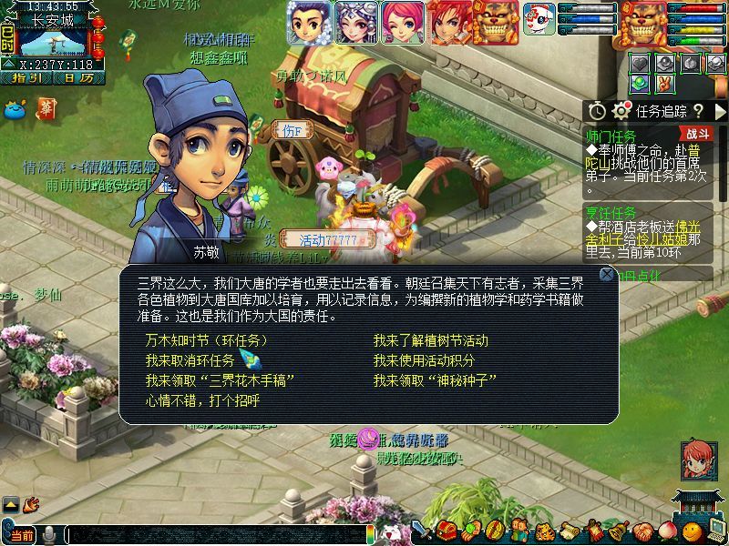 2、 每人每天可在青年苏敬(长安城230,120)处领取5次(含领取后丢弃)神秘种子。