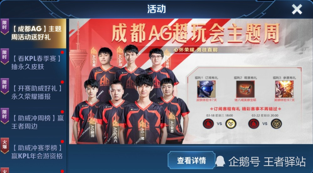 1.成都AG超玩会主题周敞开,活动期间玩家参加观战参赛使命可取得宫本武藏未来纪元7日卡、猪八戒英豪宝箱、孙悟空7日卡奖赏!