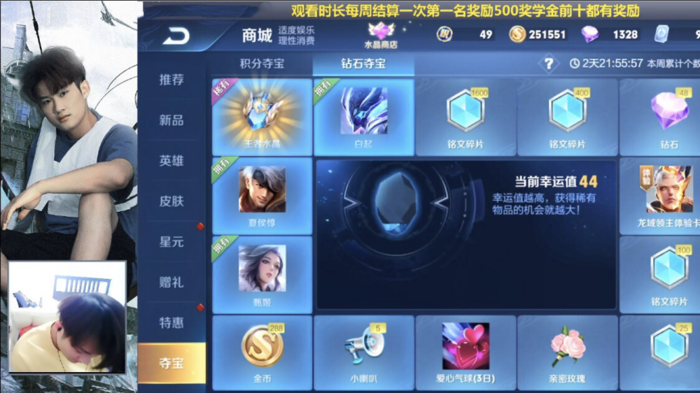 韩跑跑用1313的抽法拿到了王者水晶,此刻的幸运值才44,而这个办法是在直播间的弹幕上看到的,韩跑跑相信了粉丝们的话,先用60钻石独自抽一次,然后五连抽三次,依照这个次序不断重复抽,韩跑跑此刻还剩余800多钻石,一半钻石都用不到!
