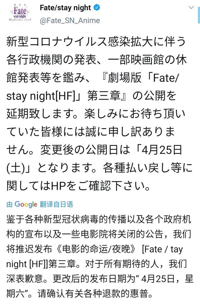 《Fate/stay night HF》第三章,中文名《命运之夜 天之杯Ⅲ:春之歌》本来预订在3月28日于日本上映,可是由于新式肺炎疫情导致部分电影院歇业,官方不得不在上映前两天宣告延期。现在定下的上映日为4月25日,和《刀剑神域》这一季开播的时刻相同,不过官方表明还有再次延期的或许。