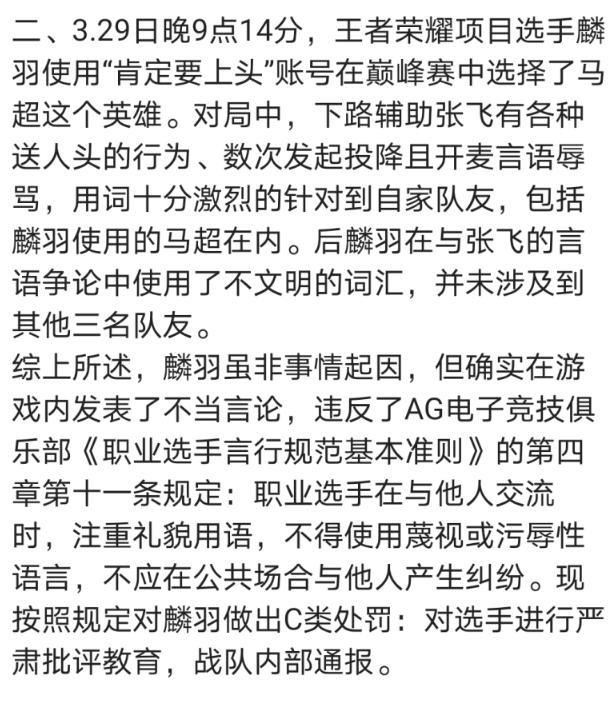 AG超玩会麟羽在一局巅峰赛中因谩骂被B站up主告发,对此AG超玩会沙龙发布了布告,表明麟羽的言辞只针对送人头的艺人张飞,尽管运用了不文明词汇却并未触及其他三名队友。尽管麟羽并非工作原因,但却是违反了沙龙的行为规范基本准则,因而会对麟羽进行严厉批判,并在战队内通报。