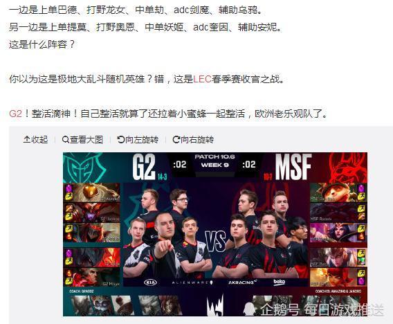 必须得说G2尽管怪了点,但发明才能不错,如奶妈上单、盖伦猫咪等等,总能拿出来一些契合其时版别的奇葩阵型。发明力强这点却是胜过LPL和LCK许多战队,这也是导致G2能拿出来一些令两大赛区接不下的阵型组合。不过G2强归强,LEC是真的弱。